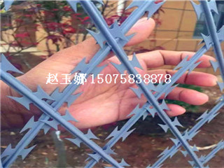 刀刺隔離網(wǎng)主要是由熱鍍鋅鋼板或不銹鋼薄板沖壓而成的,它擁有尖銳的刀片,高張力鍍鋅鋼絲或者不銹鋼絲做芯線組合而成的產(chǎn)品。由于刺網(wǎng)的形狀很特別,而且每個角度都有尖狀刀片,因而能達(dá)到極好的防御保護(hù)效果。產(chǎn)品具有結(jié)構(gòu)新穎、堅固緊密、網(wǎng)面平整、網(wǎng)孔均勻、刀鋒銳利、防攀爬、抗腐蝕性強(qiáng)等特點(diǎn)。建設(shè)于監(jiān)獄的內(nèi)外墻地面及高墻之上,網(wǎng)墻內(nèi)側(cè)或頂部加裝蛇腹形刀刺網(wǎng),形成一道高不可攀、難以逾越的隔離障